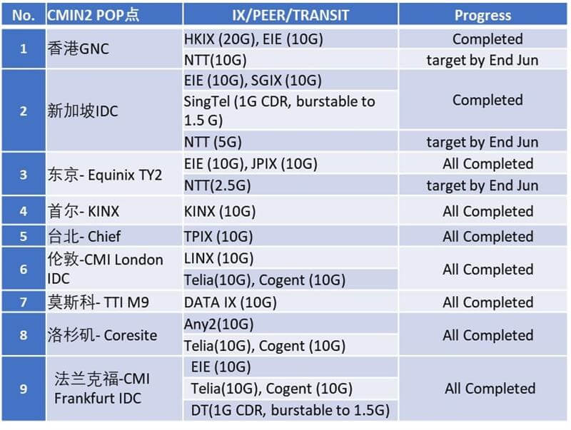 PeeringDB 显示 CMIN2 目前在洛杉矶 LA1、东京 TY2、新加坡 GS1、香港 GNC、法兰克福、伦敦等十余个数据中心部署核心节点,并在多家 IX 与 Tier‑1 直连。且大部分为10G-20G 连接